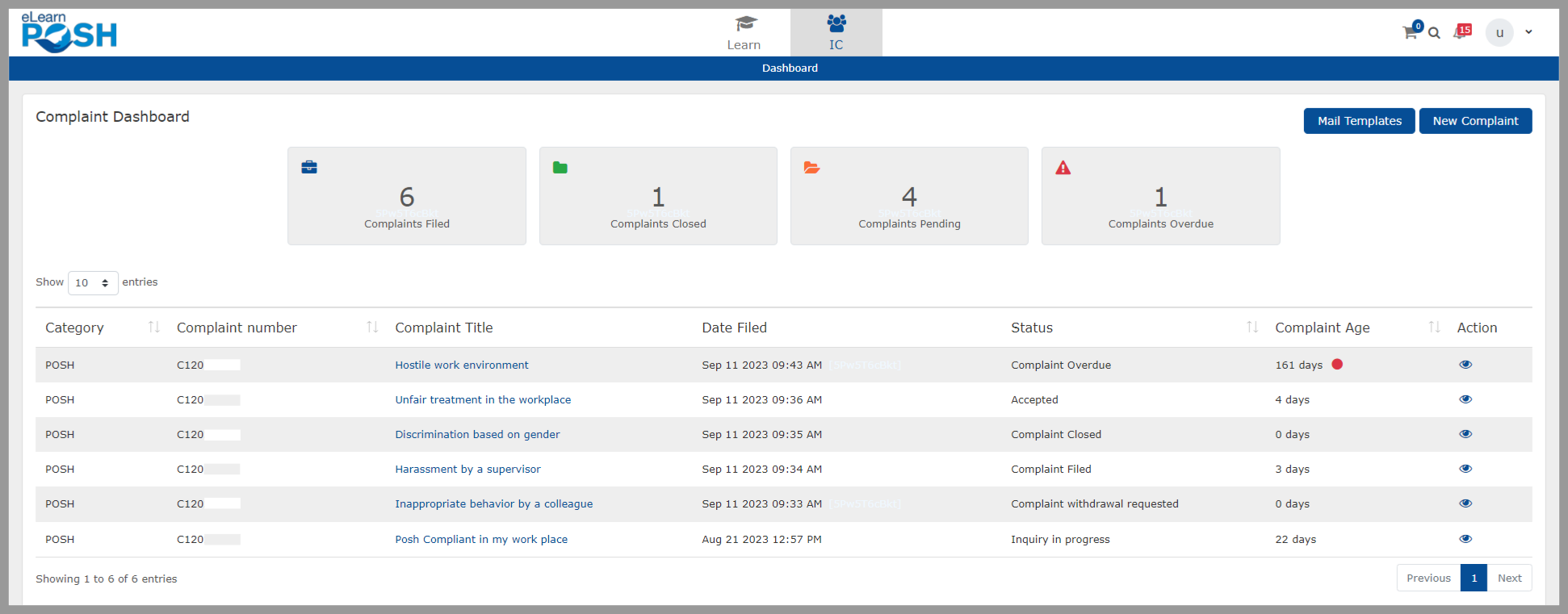 The Complaint Dashboard allows you to view a list of raised complaints, including the complaint number, date, status, and age of the complaint.
