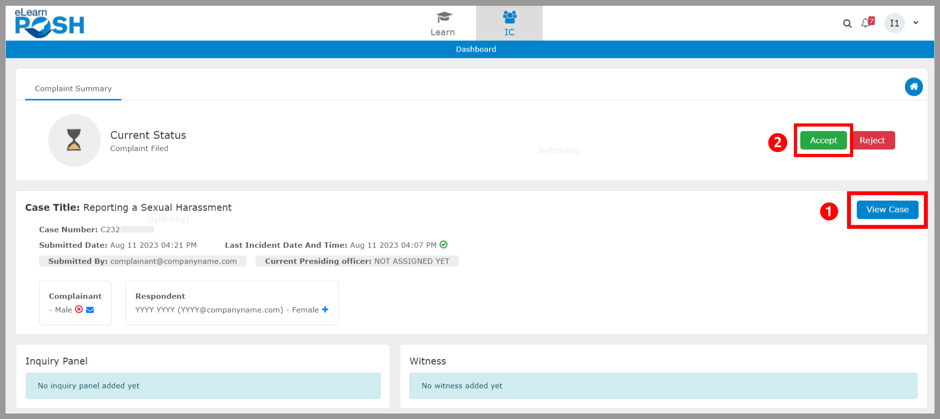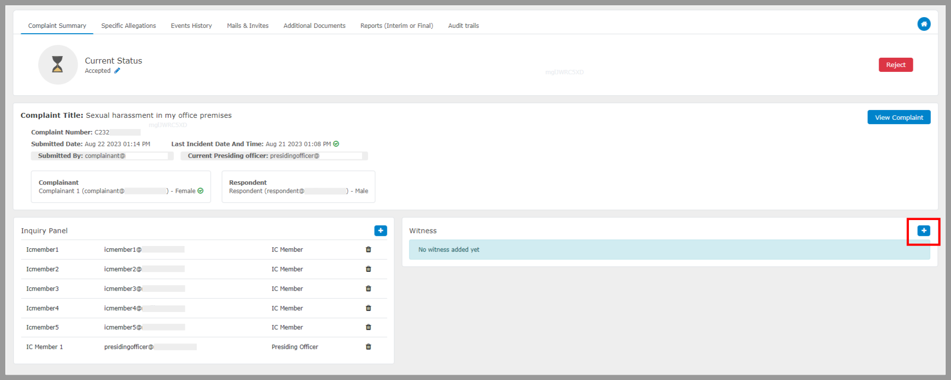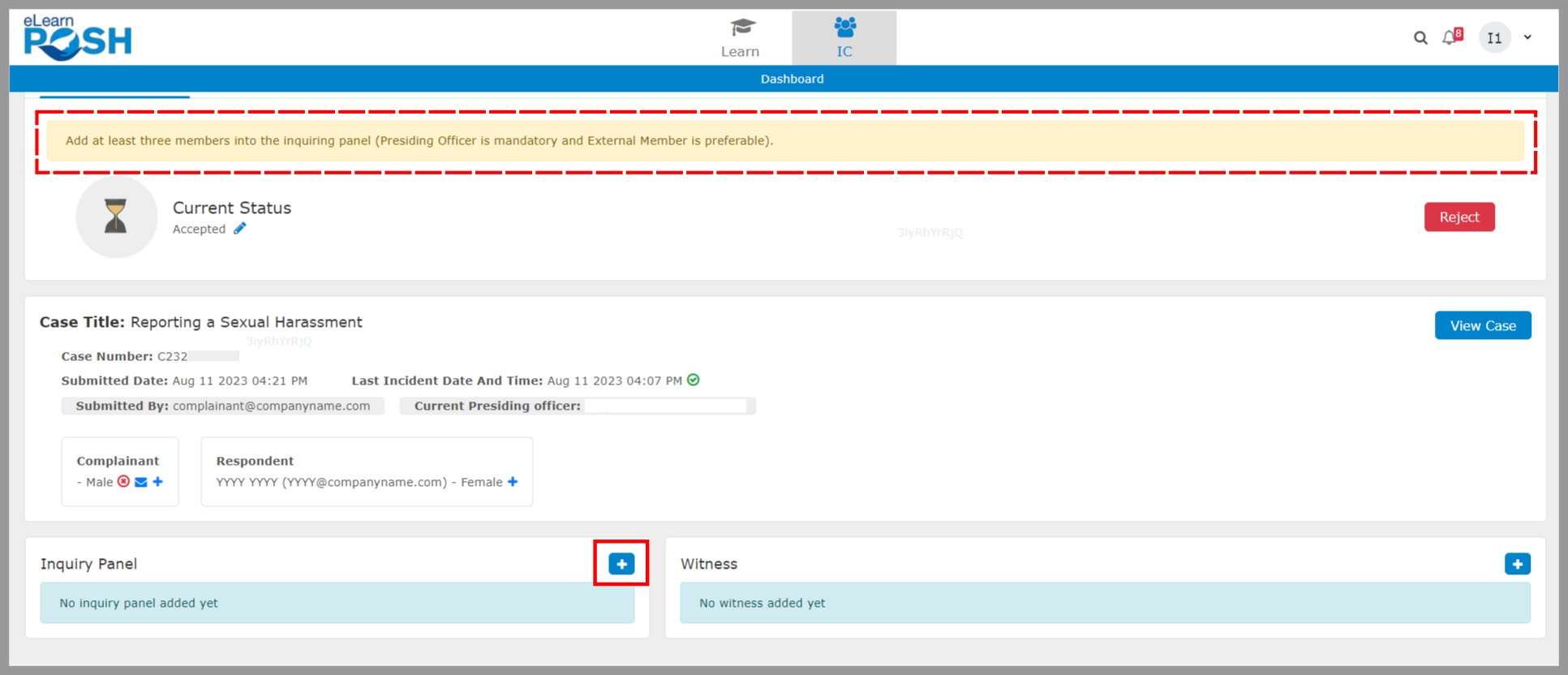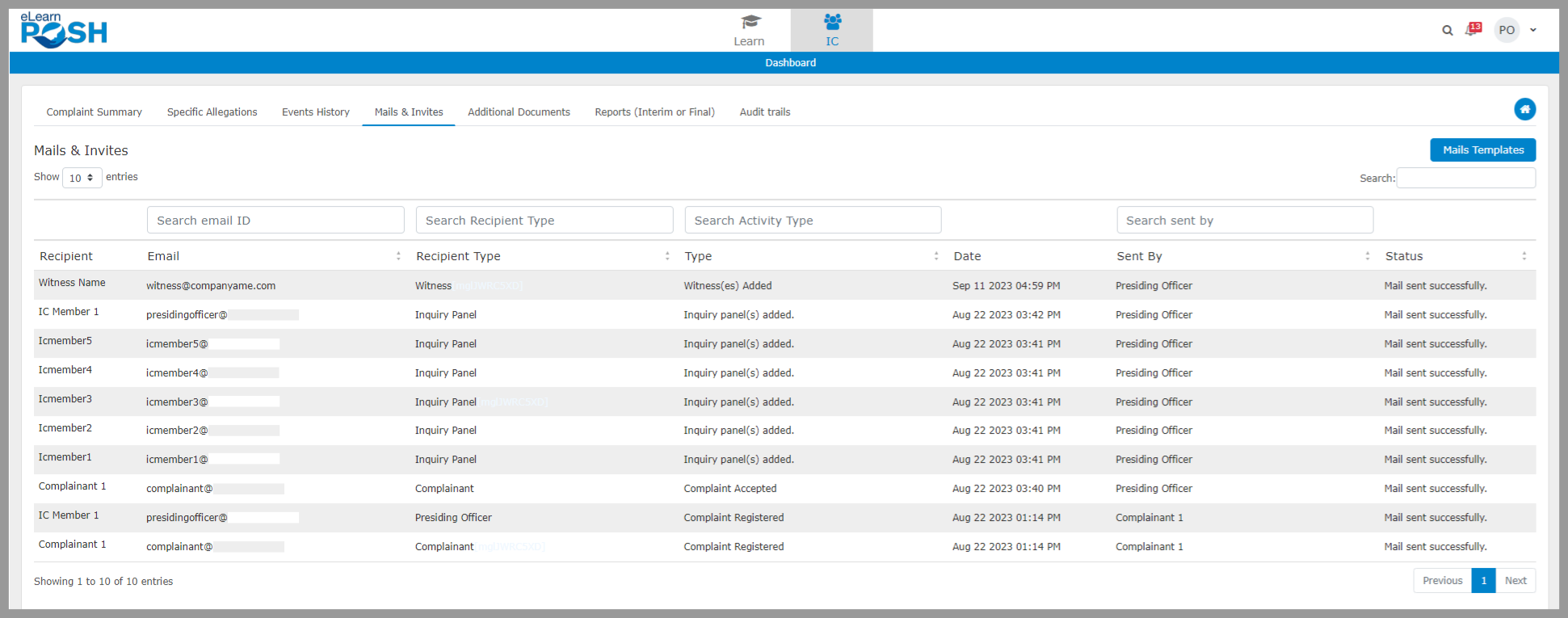 Please Note: For each activity, such as adding an IC member to the panel or introducing a new witness, emails will be generated by the Learning Management System (LMS) and sent to the respective email addresses.