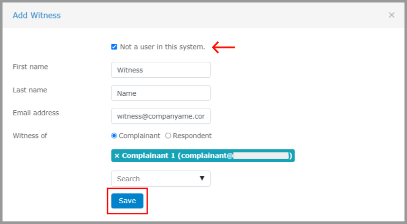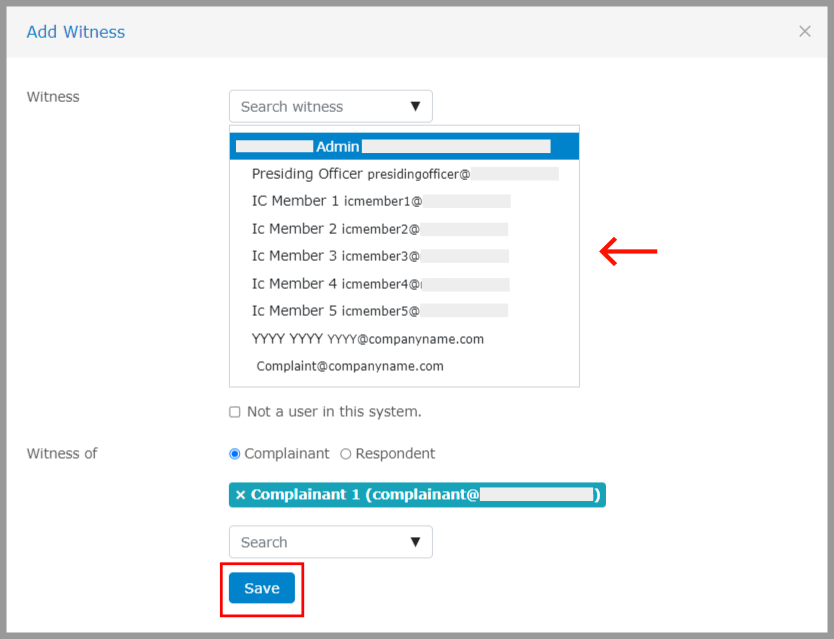 Step 2: Select the Witness’s Email ID from the drop-down (if available on the LMS). If the Email ID is not available on the portal, select “Not a user in the system” and enter the witness’s Email ID, First Name, and Last Name. Also, choose the “Witness of” option and click Save.