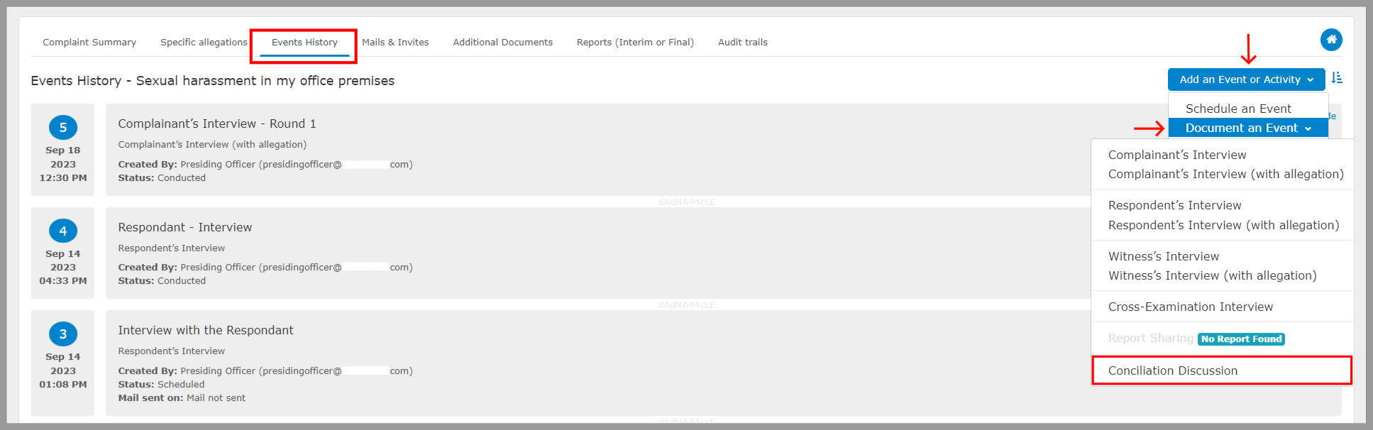 Step 1: Choose “Events History”, select “Document an Event” under “Add an Event or Activity” and then select “Conciliation Discussion”.
