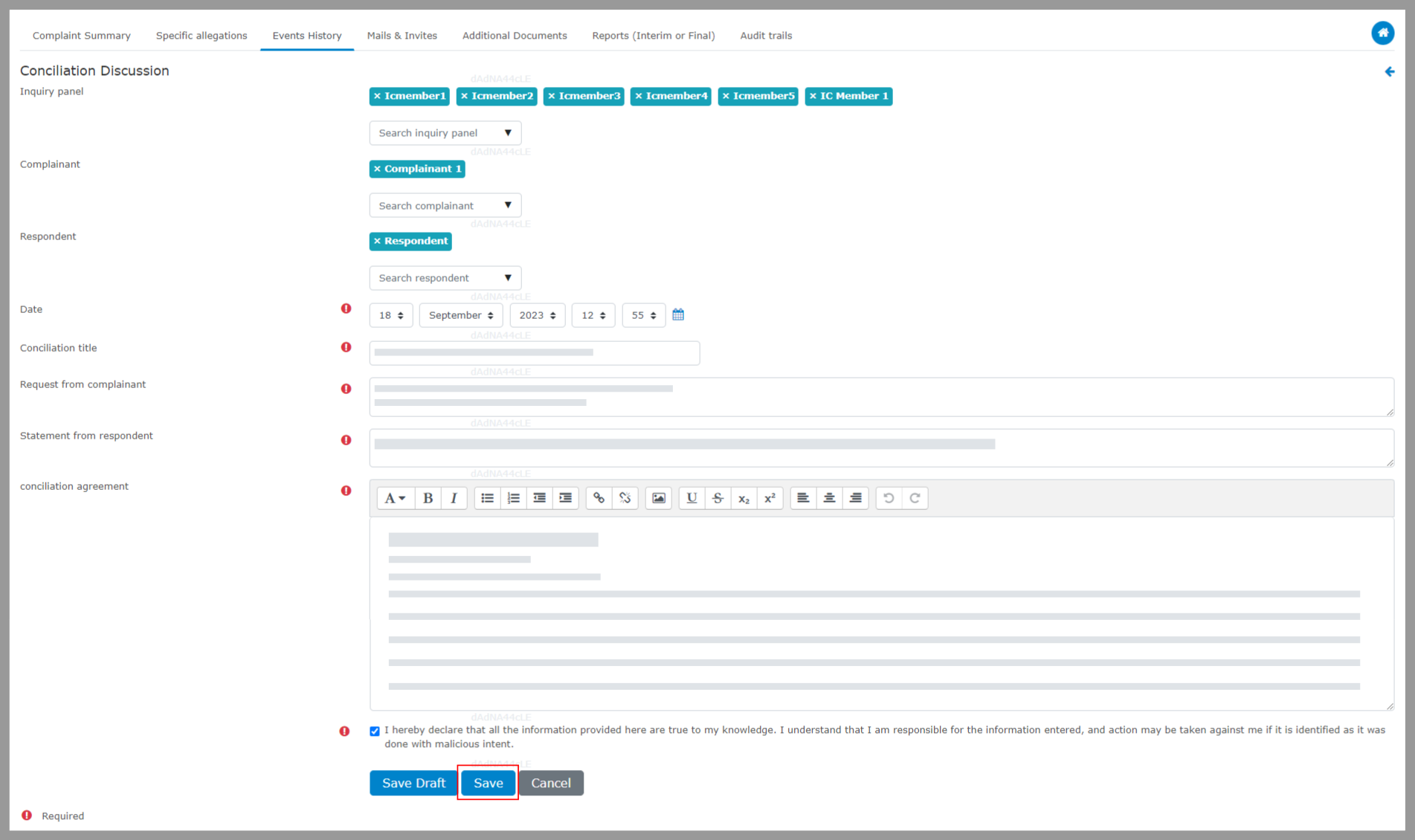 Step 2: Fill in the details of the meeting, including the panel member who attended the event, date, conciliation title, request for complaint, statement from the respondent, and Conciliation Agreement, then select “Save.”