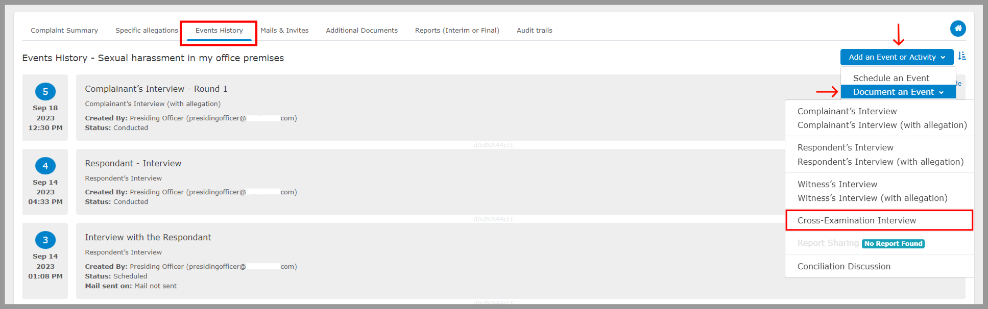 Step 1: Choose “Events History”, select “Document an Event” under “Add an Event or Activity” and then select “Cross–Examination Interview”.