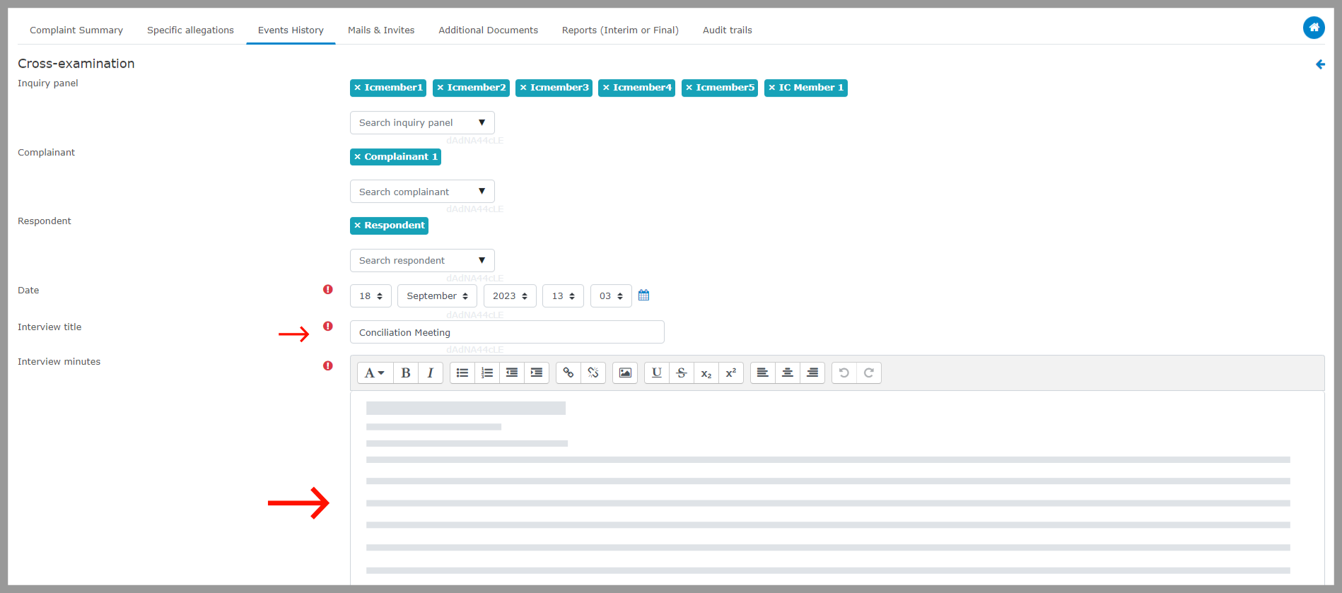 Step 2: Fill in the details of the meeting, including the panel member who attended the event, date, conciliation title, and interview minutes.