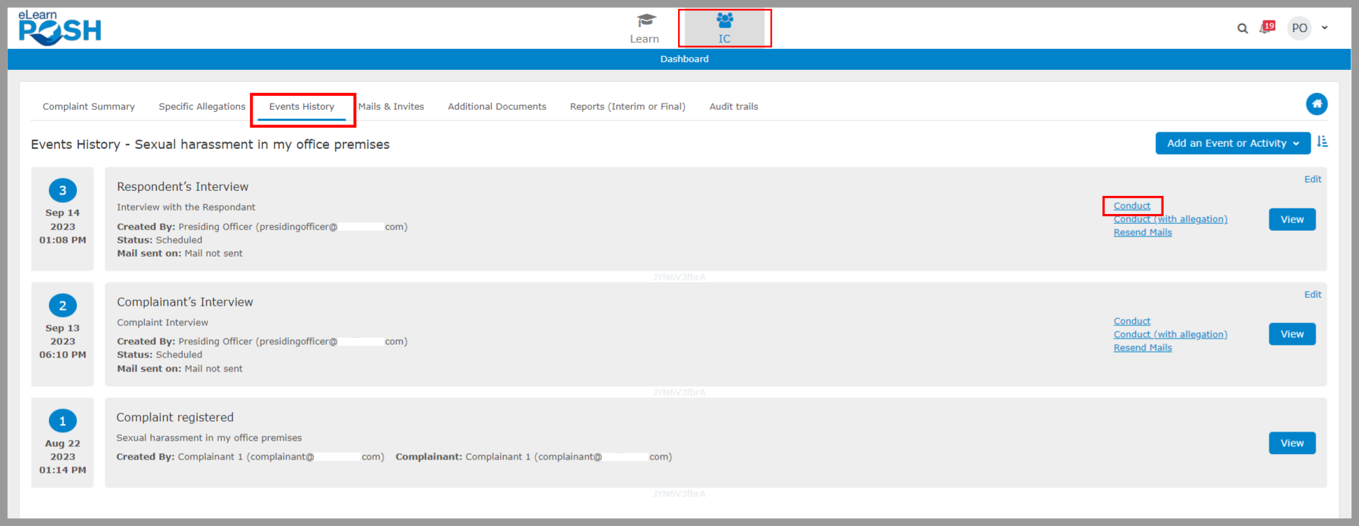 Step 1: Go to “Events History” and choose the “Conduct” option for the previously scheduled event.