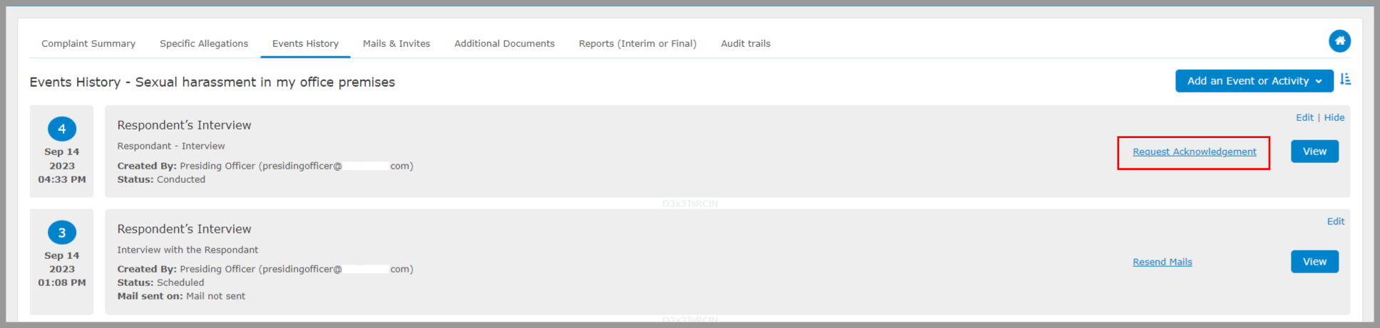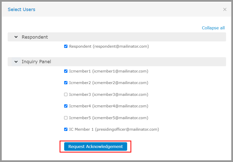 After the inquiry panel has concluded the interview or event, the presiding officer can share the minutes of the meetings with the attendees. This action can guarantee that participants are adequately briefed on the meeting minutes and can inquire about any concerns they may have regarding the minutes. Click on the “Request Acknowledgement” option to send an email and collect acknowledgements from the attendees. If the attendees do not have any issue with the minutes of the meeting then they can acknowledge the minutes.