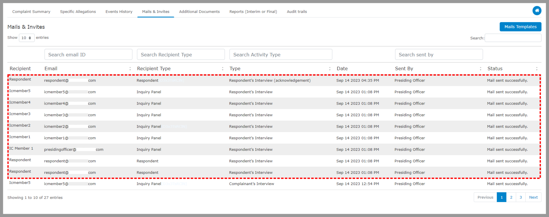 All the emails sent while handling a complaint will be listed and tracked under “Mails & Invites.”