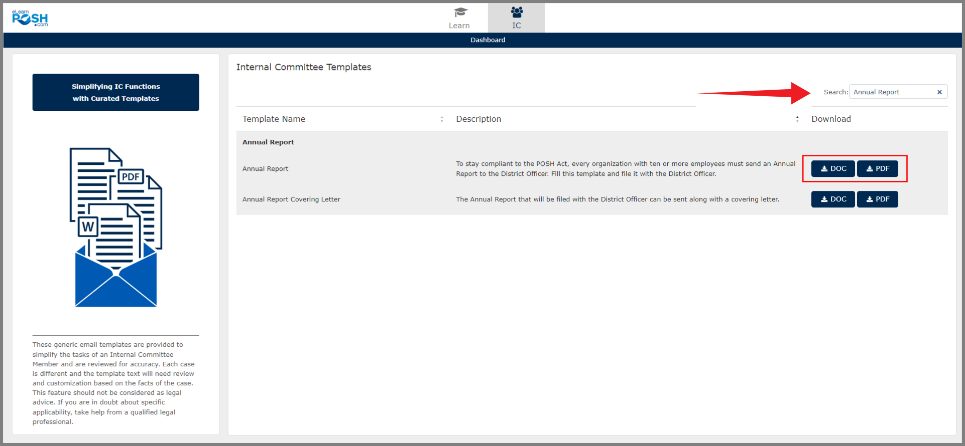 The template library contains all the templates that IC members need. It includes templates for board resolutions for the constitution of the Internal Committee, email templates needed for conducting POSH inquiries, and the necessary templates for filing the annual report. To use the template library: