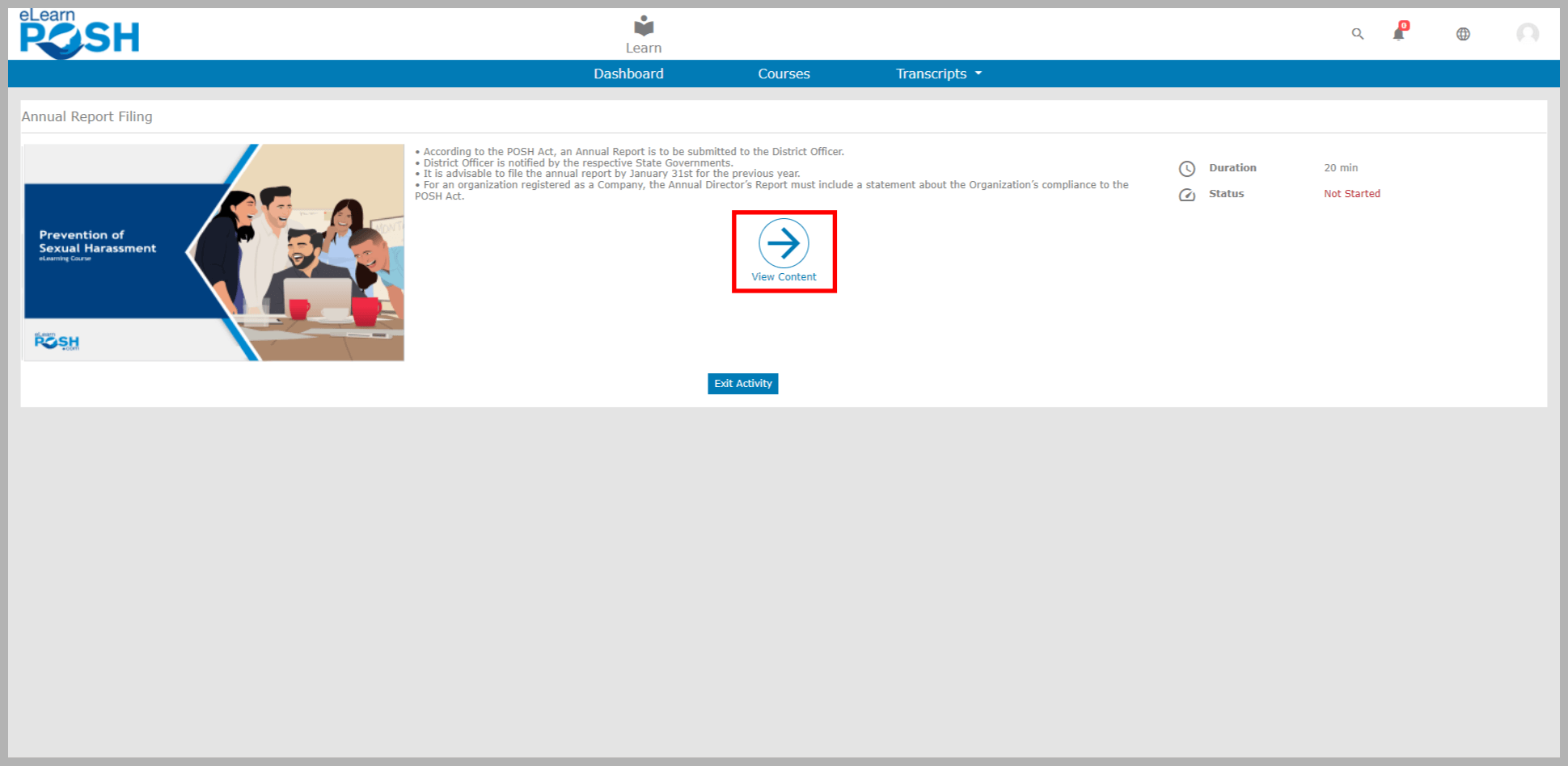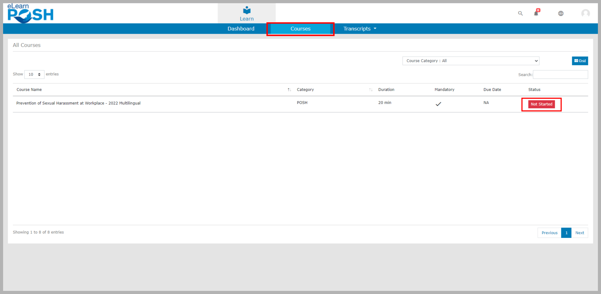 You can also go to the Courses page to start a course. Click ‘Courses’ and then click ‘Not Started/In Progress’ to start the course