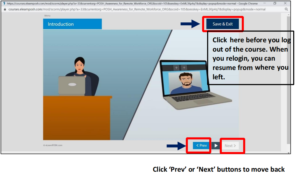 The course will launch on the new window. Click the ‘Start’ button from the welcome page to progress the course. You can click on the “Save and Exit” button to save the progress of the course.