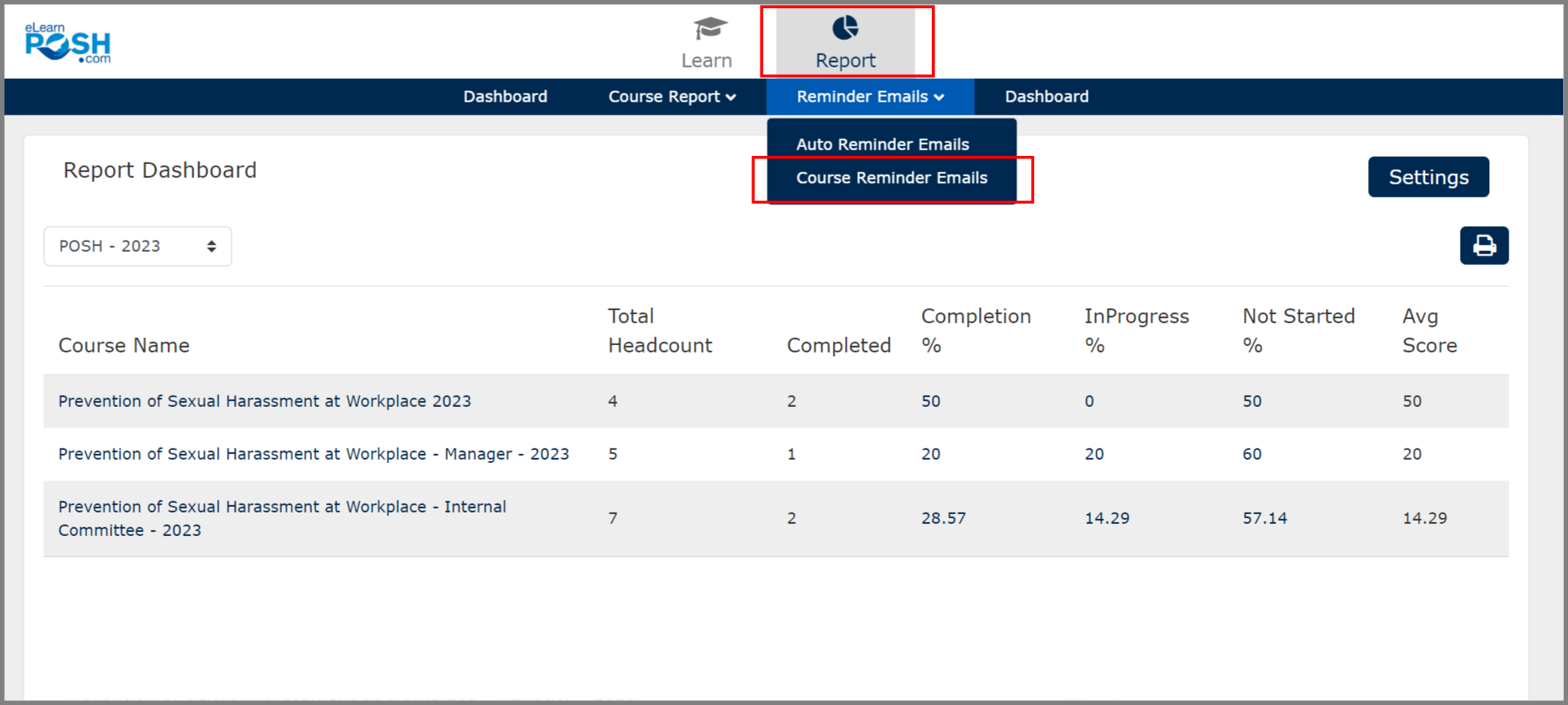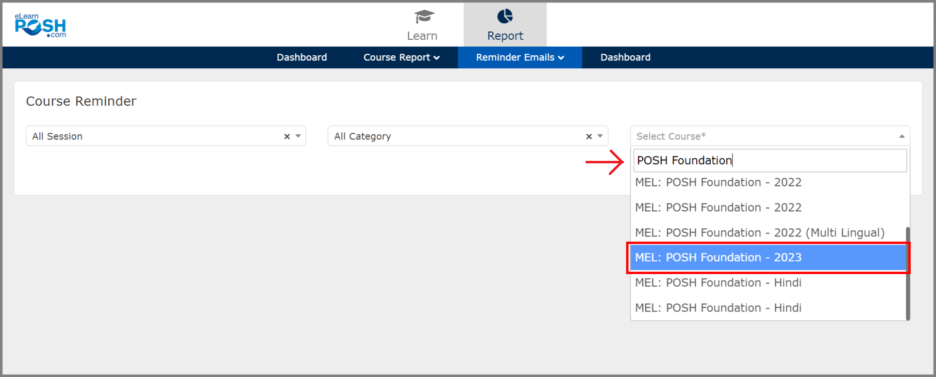 Step 2: Click Select Course dropdown, pick a course for reminder emails, or search within the dropdown, as shown below.