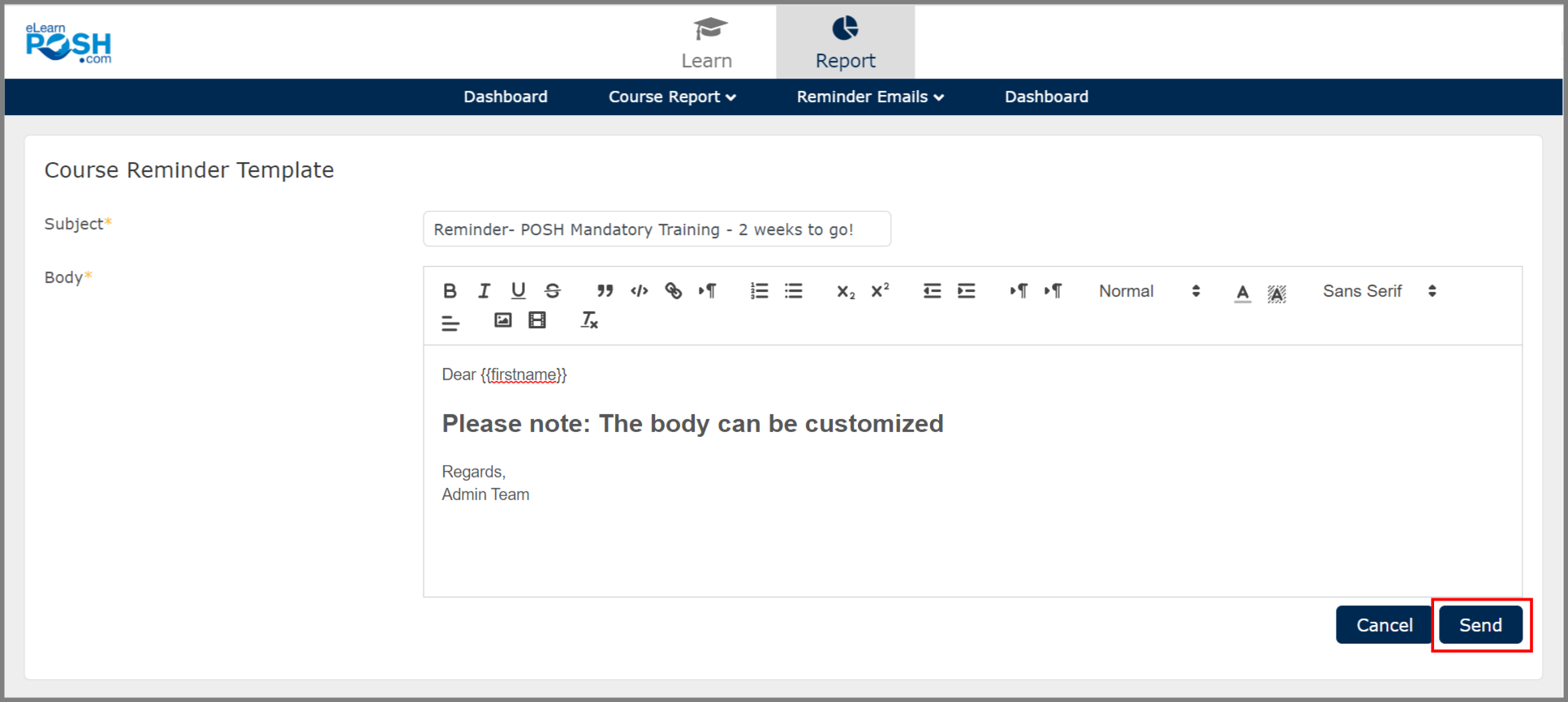 Step 4: You can customize the email subject and body but not the {{Firstname}} in the email body (as this data will be pulled from the LMS). Click Send to roll out the reminder emails
