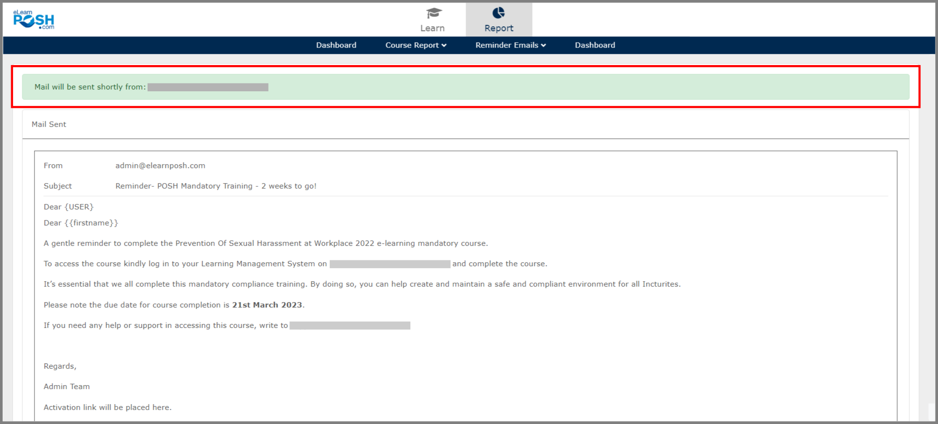 Step 5: A pop-up appears when the reminder emails are successfully triggered from the LMS