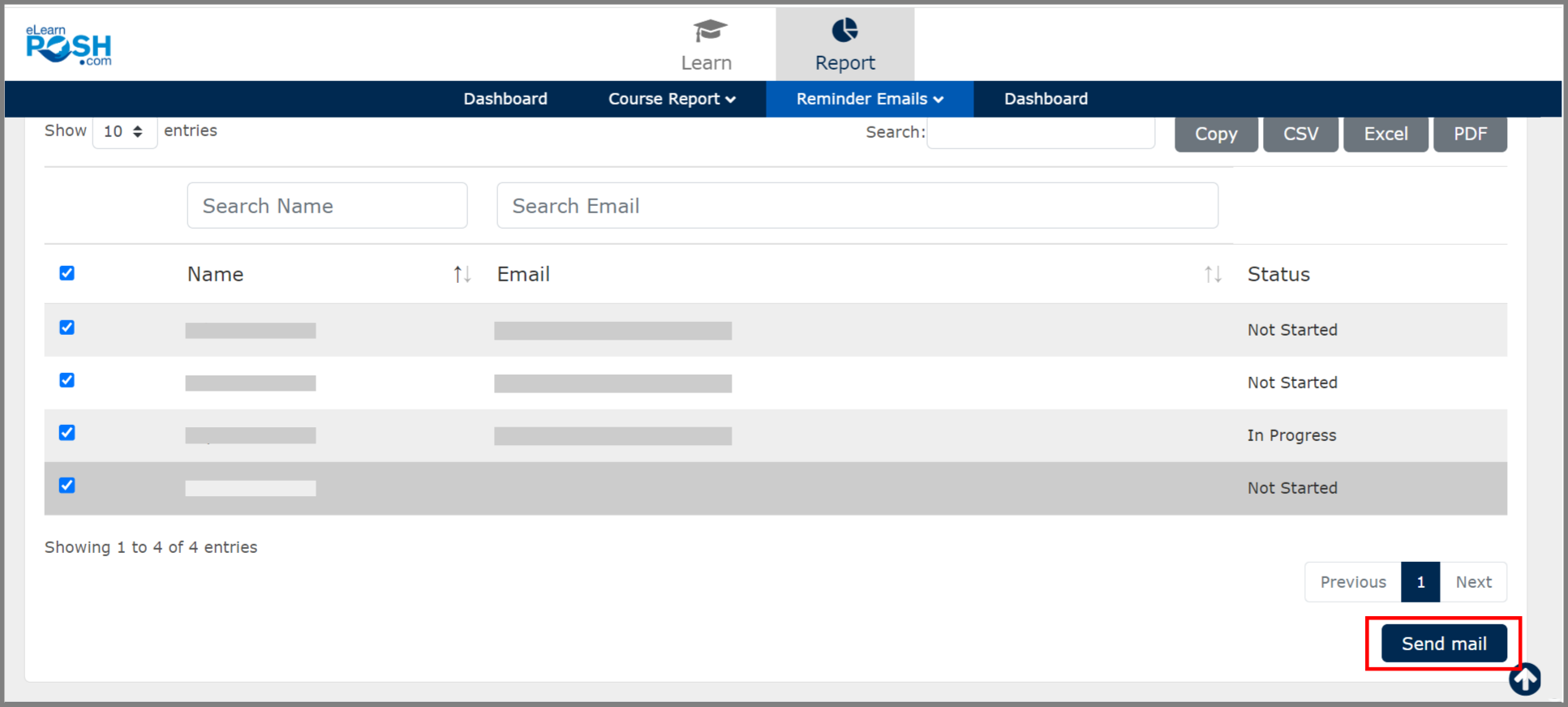 Step 3: You will see the user details and their status (Not Started or In Progress). If required, you can select or unselect individuals from this list through the checkbox. Once done, click the Send Mail button at the bottom of the page