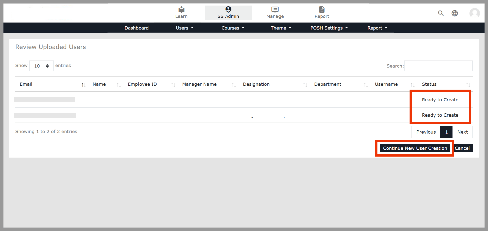 Choose Continue New User Creation at the bottom right of the page only when all users’ statuses show as “Ready to create.” If there are errors, you won’t be able to proceed until you fix them in the Excel sheet, and these errors will be displayed on the right side.