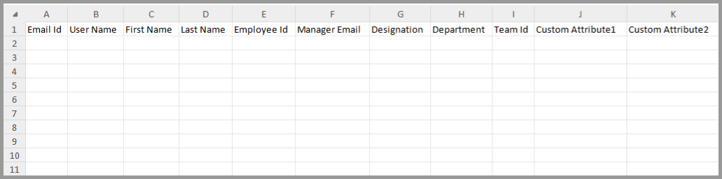 Fill in user details (First Name, Last Name, Email, Employee ID, Manager Email, Department, and Designation) in the CSV file you downloaded. Save it as a CSV UTF-8 (comma delimited) format.
