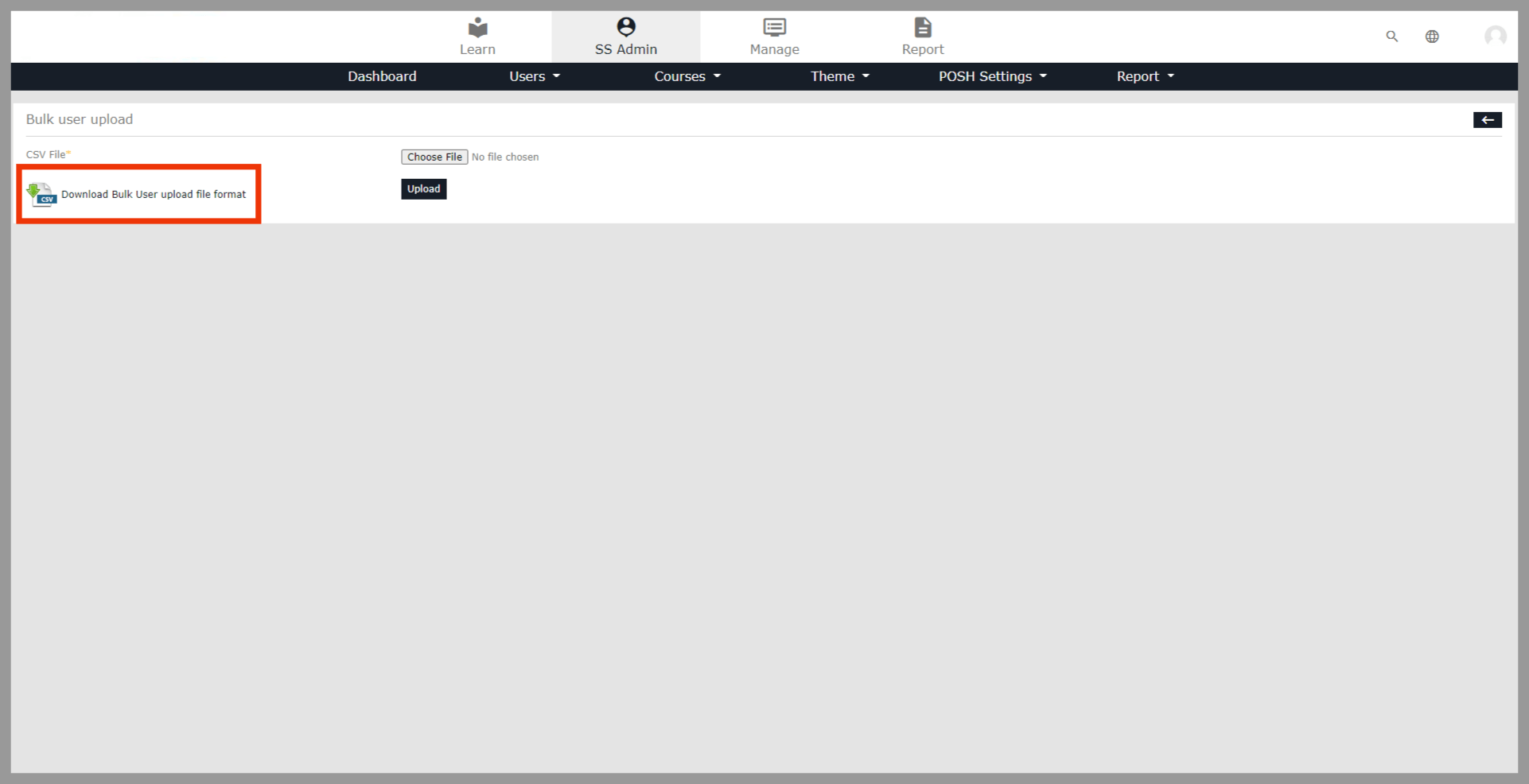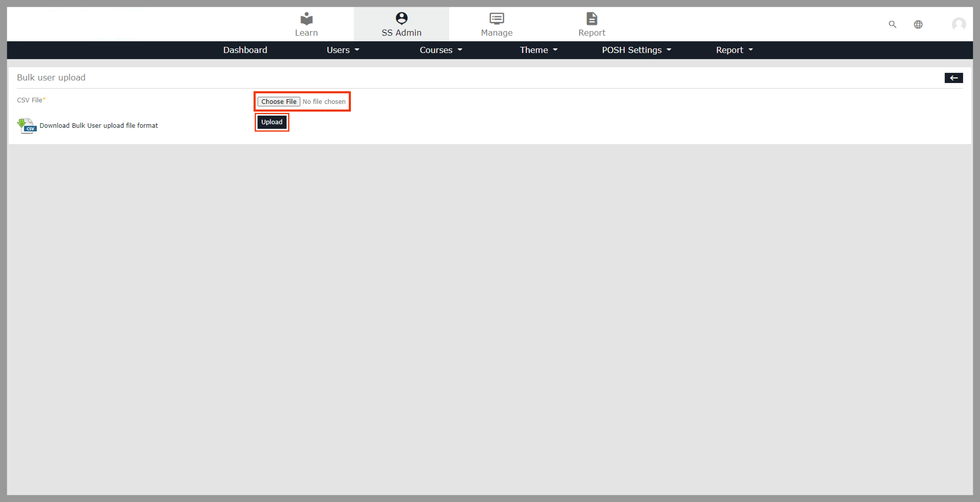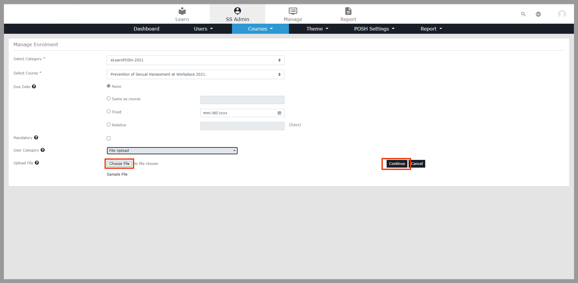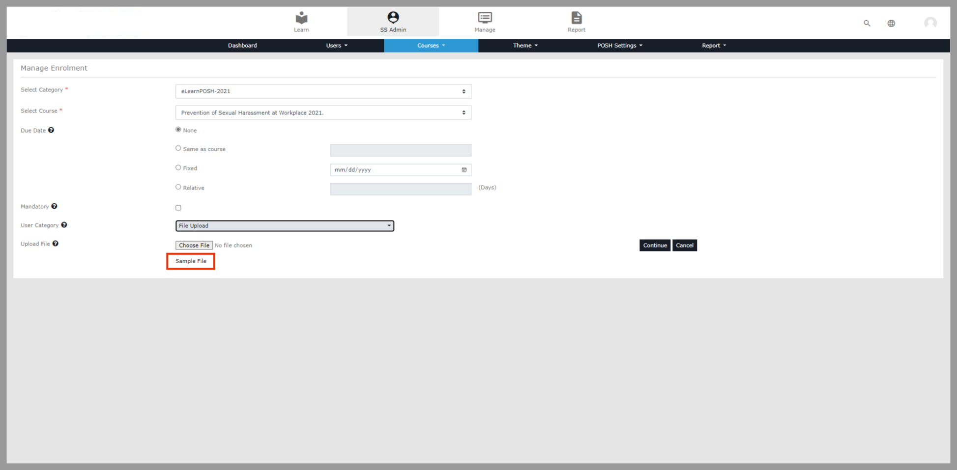 Select the File upload option in the User Category drop down menu. Click the Sample File to download the excel sheet.