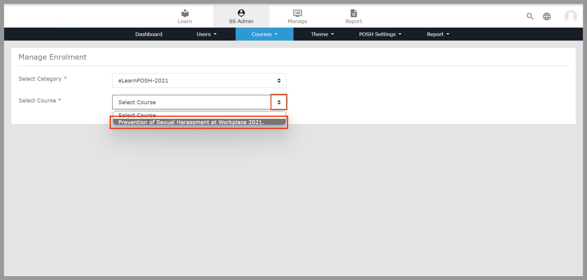 In the SS Admin, select the Courses option and then select Manage Enrollment