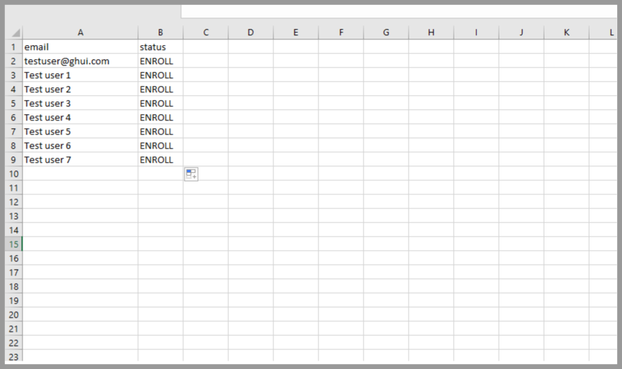 Enter the user email IDs in a list and update the “Status” column to “ENROLL.” Save the file as CSV in UTF-8 (comma delimited) format.