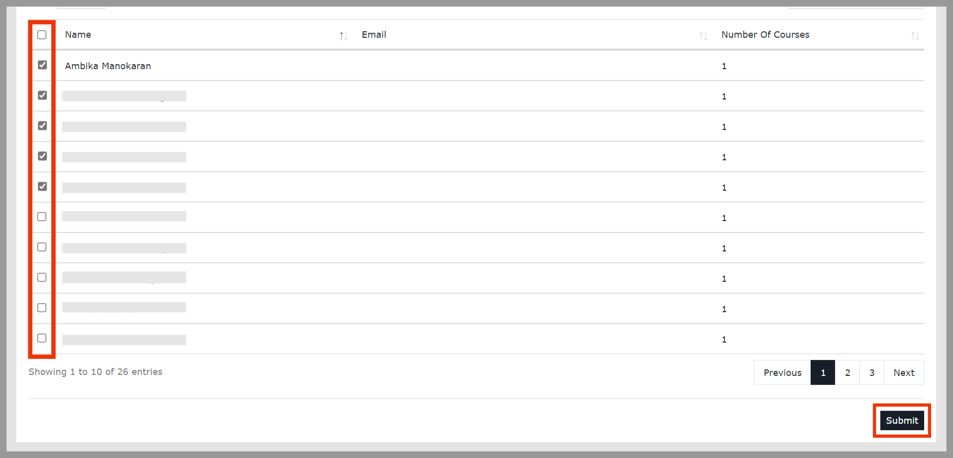 Search the username and select the Check box on the left side. Click the Submit button option in the bottom right of the page