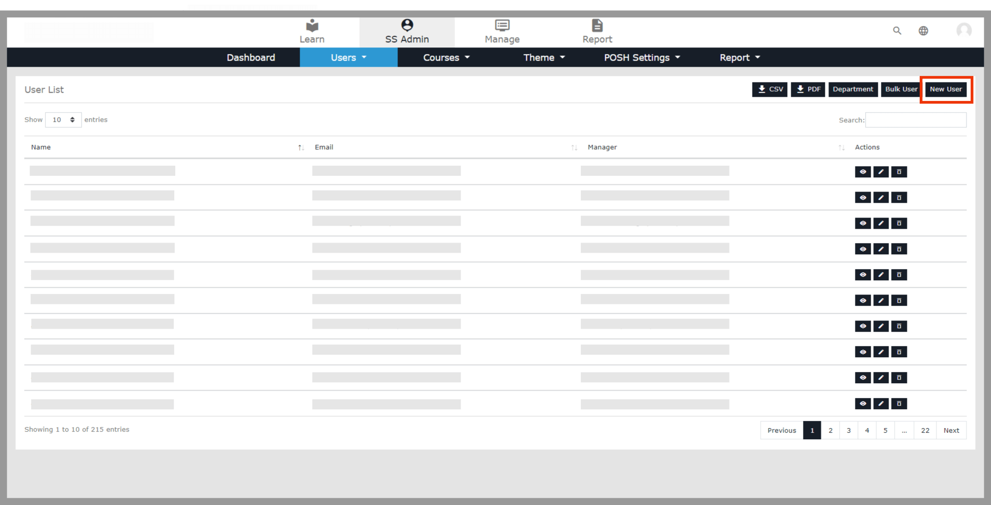 In the User List, click the option New User button on the top right of the page