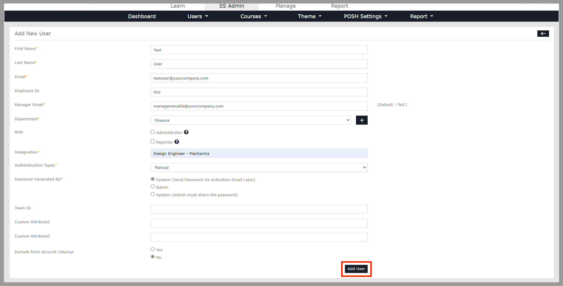 Complete the user information, and once finished, select the Add User option.