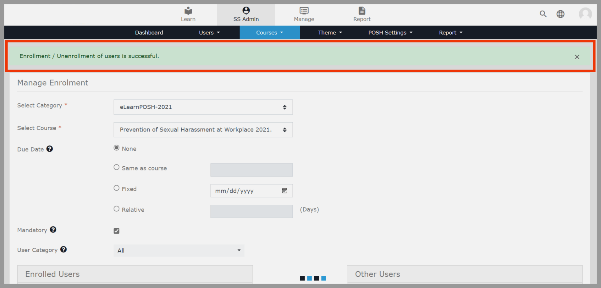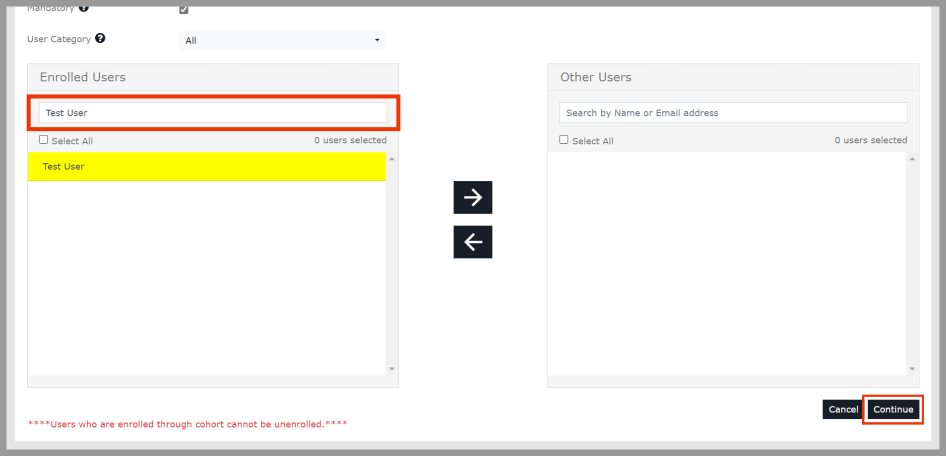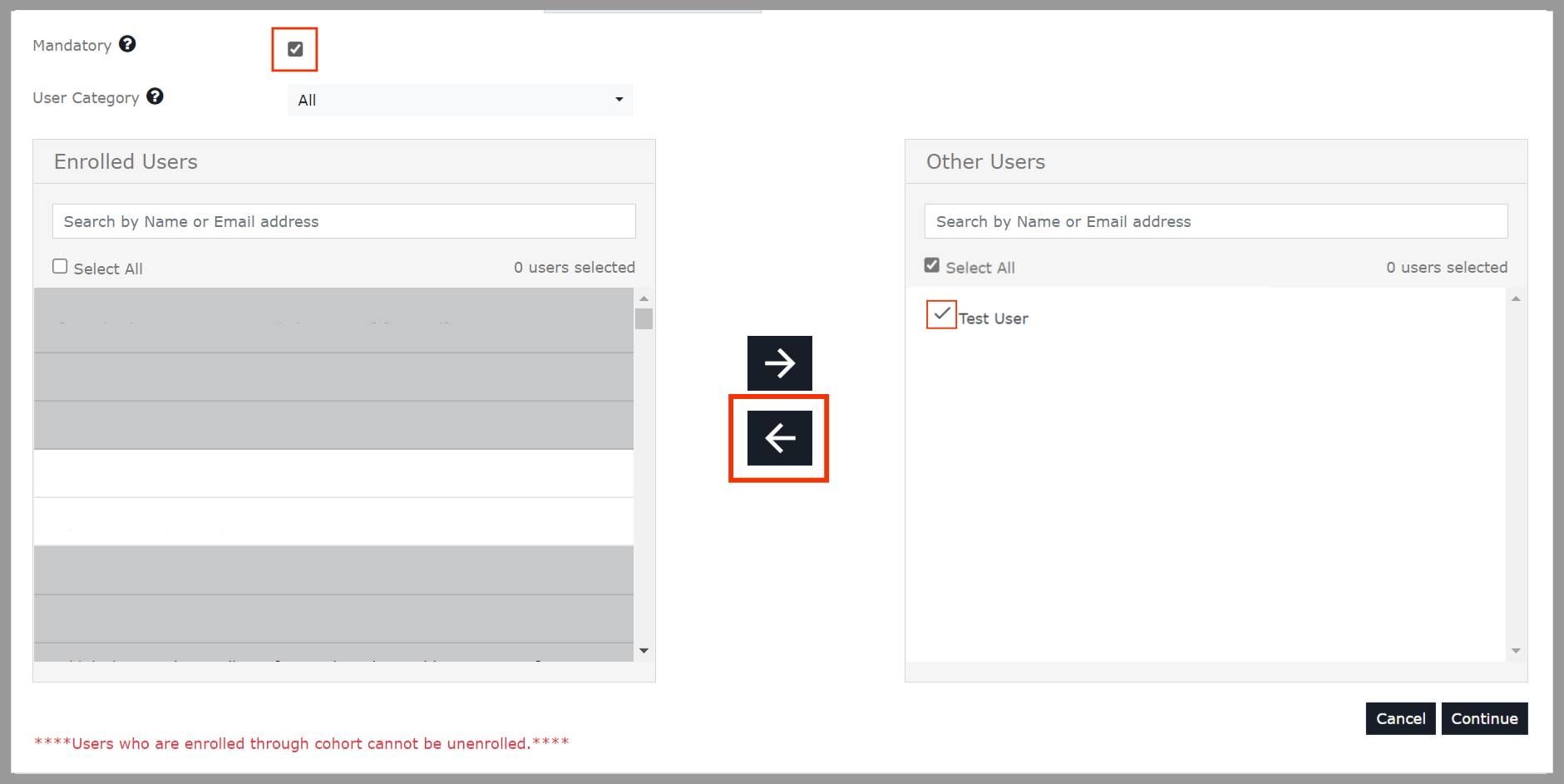 Enable the Mandatory option, Search for the respective user ID under the Other Users column, select the particular user ID, and click the left arrow icon to move the user ID to the Enrolled User column